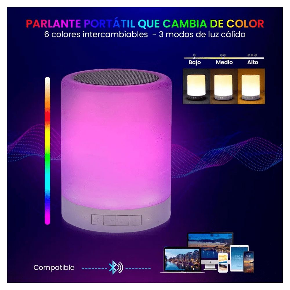 Esta lampara/parlante viene con modo de luz que cambia de color. Toca la parte superior del altavoz para cambiar el color de la luz o la intensidad. Compatible con todos los dispositivos bluetooth. Micrófono incorporado que admite una excelente capacidad de manos libres debido al software de cancelación de ruido. Le permite responder, rechazar y finalizar llamadas sin sostener su teléfono inteligente. Provee cable de conexión y puerto de entrada micro USB para carga y salida auxiliar de 3.5mm para dispositivos que no son Bluetooth.